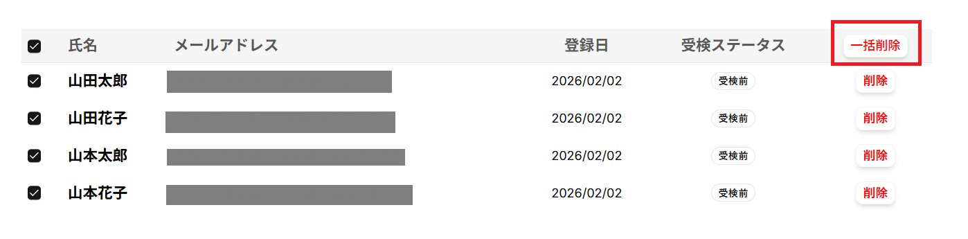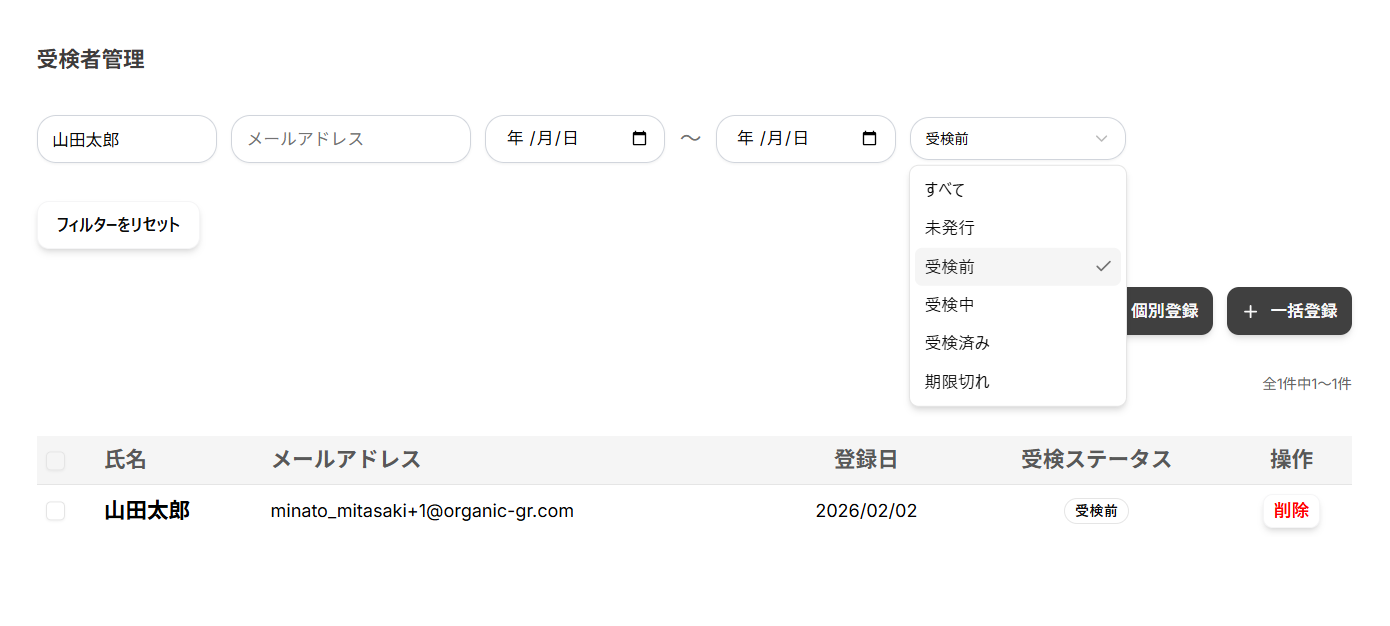 受検前ステータスの対象者は、取り消し処理(削除)が可能です。