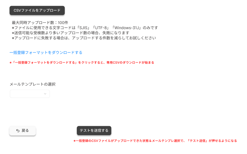 受検案内を送信したい対象者の情報が記載された、CSVファイルをアップロードしてください。
