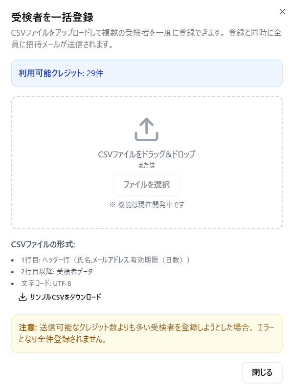 ※CSVファイルのフォーマットは、「一括登録」ボタン押下時のPOP表示内よりダウンロードできます。