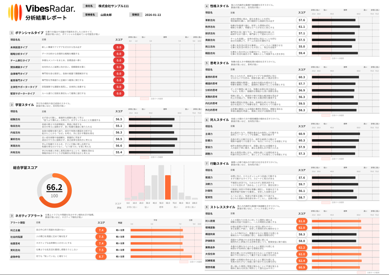 PDFはA4サイズ一枚に、すべての測定項目が表示されます。