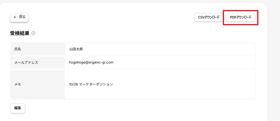 個別受検結果画面の右上「PDFダウンロード」ボタンを押下すると、結果をPDFでダウンロードできます。