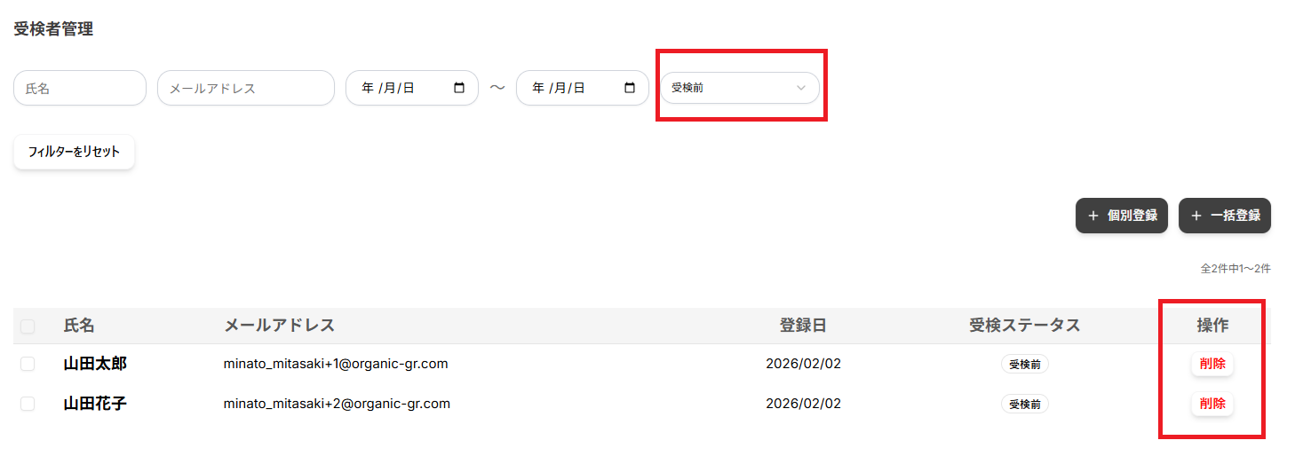 受検者管理の操作「削除」ボタンを押下することで、取り消し完了です。