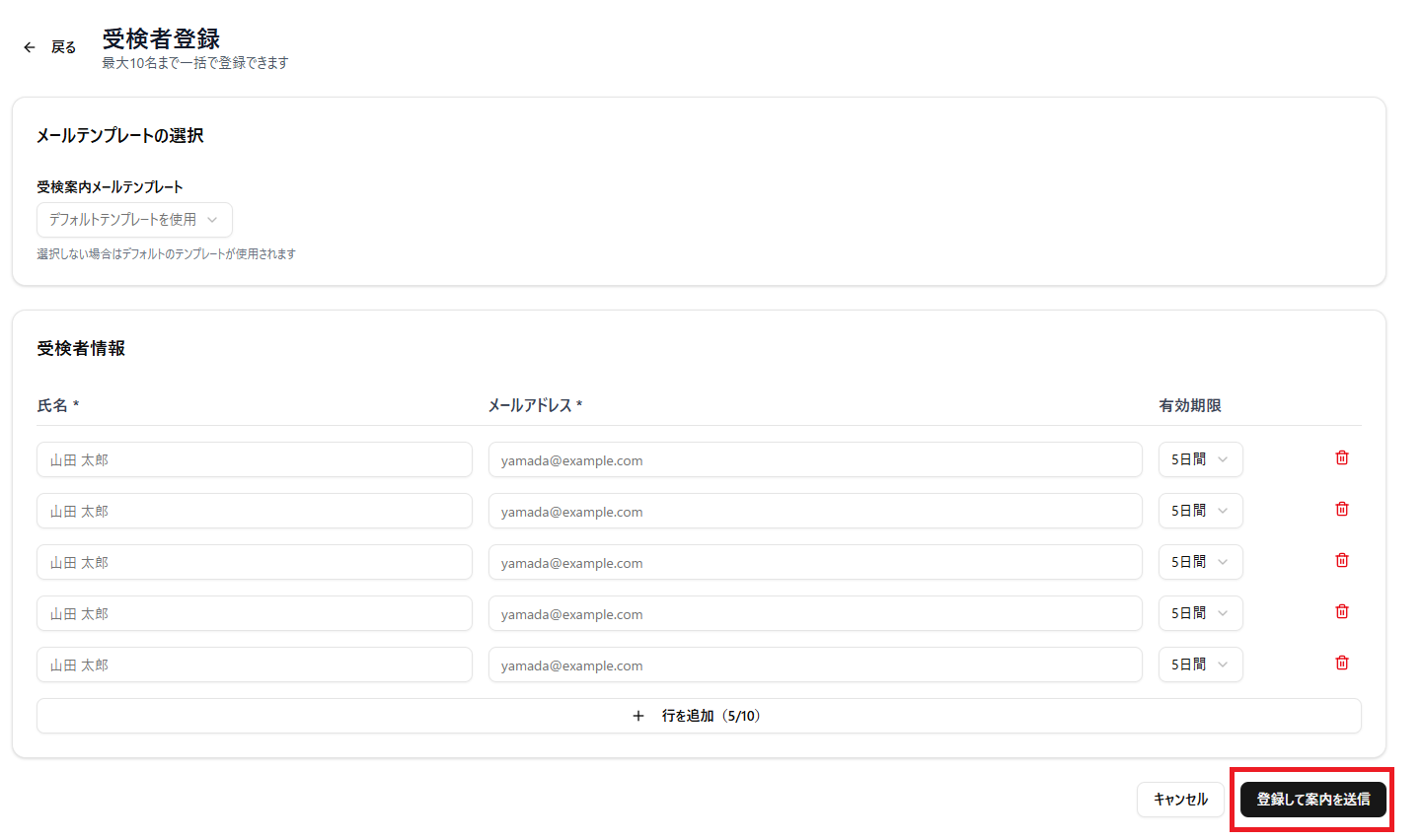 氏名・メールアドレス・有効期限を入力して、「テストを送信する」ボタンを押下します。