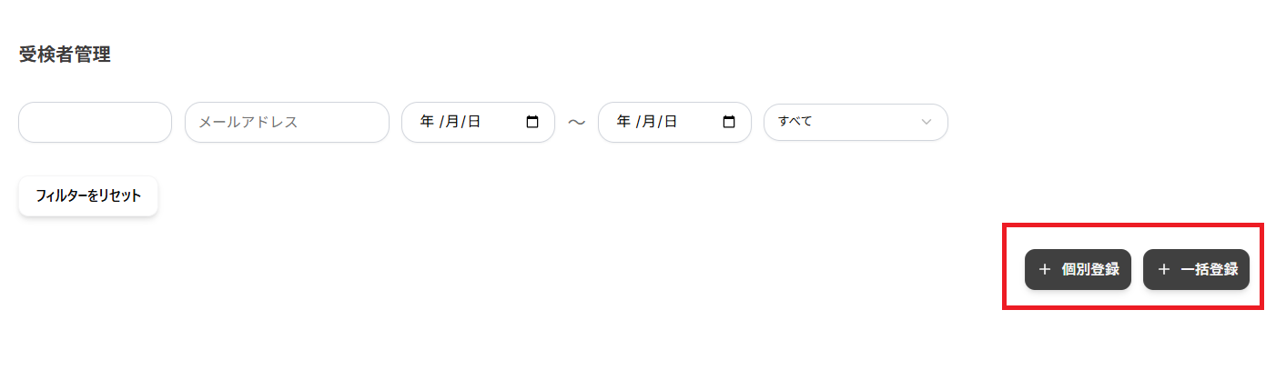 「受検者管理ページ」から、個別登録/一括登録を選択します。