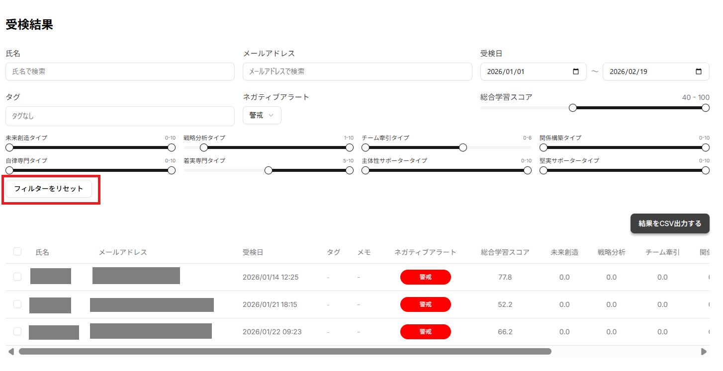 受検結果ページから、任意の項目でフィルターをかけることで、対象の受検者が一覧で表示されます。フィルターを外す際は、「フィルターをリセット」ボタンを押下してください。
